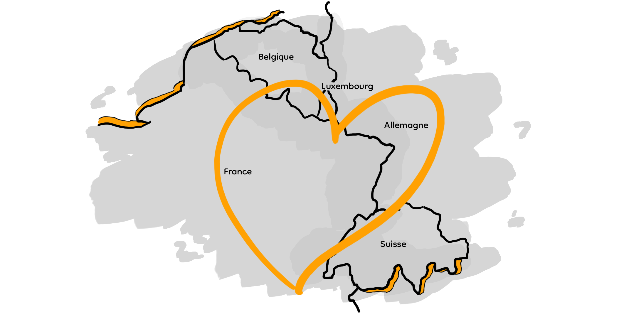 Un départ du Rhône et une boucle en forme de cœur en France, Belgique, Luxembourg, Allemagne et Suisse.